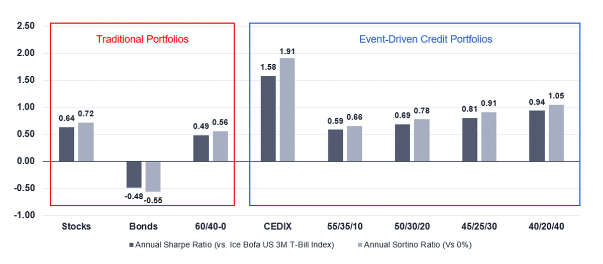 The Sharpe and Sortino Ratio chart below demonstrates Event-Driven Credit’s potential value in a diversified portfolio. The Sharpe ratio measures the average return earned over the risk-free rate per unit of volatility, while the Sortino ratio is similar but focuses only on downside volatility. When comparing Event-Driven Credit, the Event-Driven Credit Portfolios, and Traditional Portfolios, the Sharpe and Sortino Ratios increase commensurately with each incremental weighting to Event-Driven Credit, further emphasizing the potential value of incorporating Event-Driven Credit into a diversified investment portfolio.
