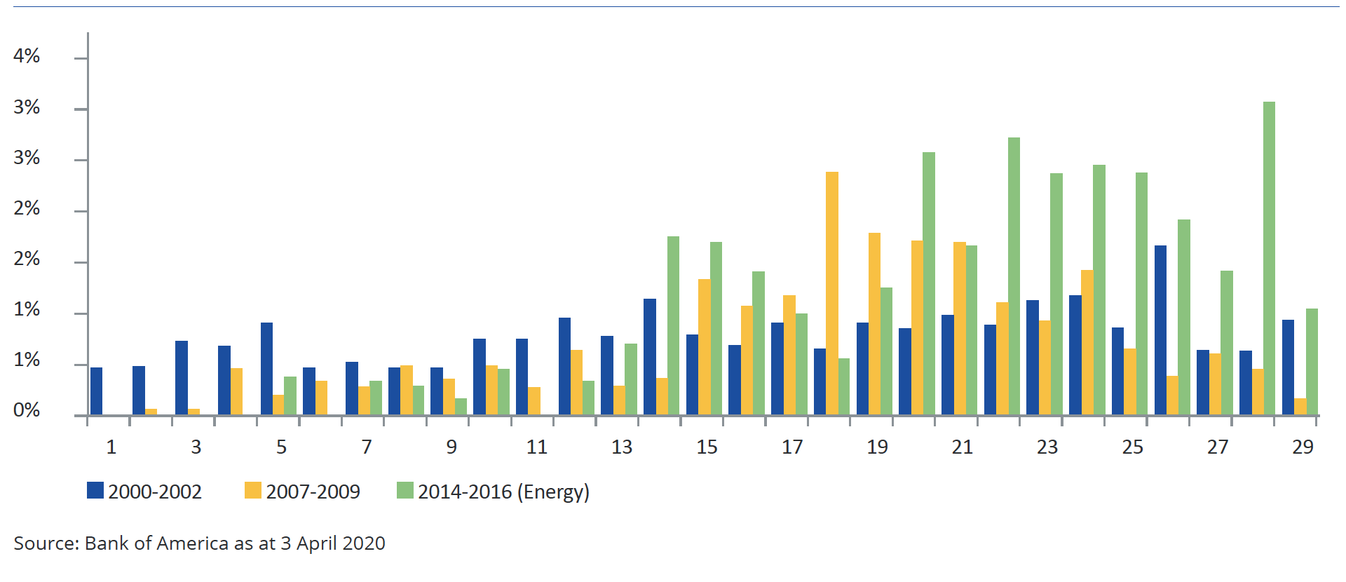 Indeed, as shown in chart 4, in the last three periods of contraction, default rates don’t meaningfully accelerate until we are some way into the recessionary period. The reality is that we don’t know until we have meaningfully progressed into the recession the true extent of the stress felt (and this is likely to be even more the case this time around as the impacts of unusually quick and meaningful monetary and fiscal support are digested and their effects take hold or otherwise).