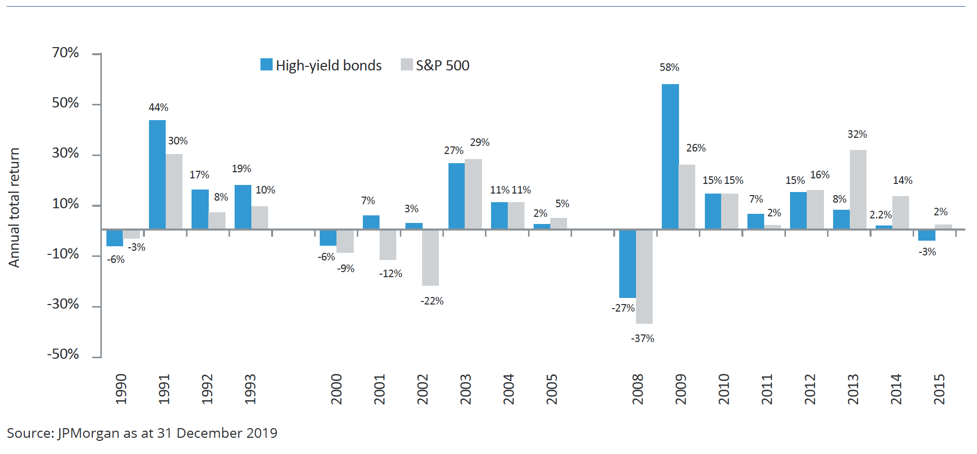 In short, HY typically outperforms equities during down years and in the subsequent years as the economy emerges from recession. For instance, from 2000 to 2005, US HY outperformed S&P 500 by 55%. Looking further back to 1990-93, HY returns exceeded those of the S&P by 33%.
