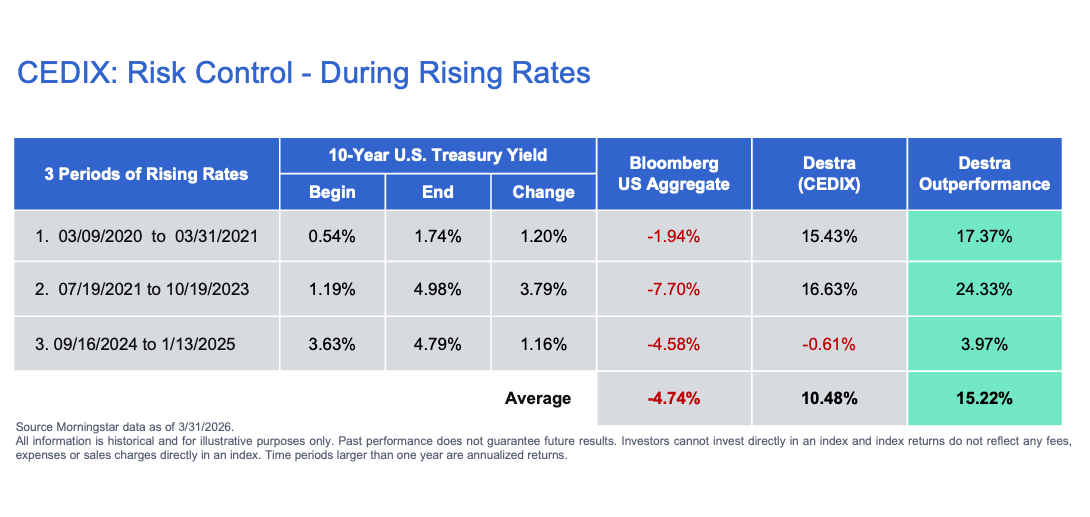 The Fund has also demonstrated its ability to control risk during periods of rising interest rates in relation to the Bloomberg Barclays US Aggregate Bond Index. During the three periods of 100+ bps increases in the 10 Yr Treasury Yield, the Agg has averaged a loss of -4.74% vs CEDIX average return of +10.48%.