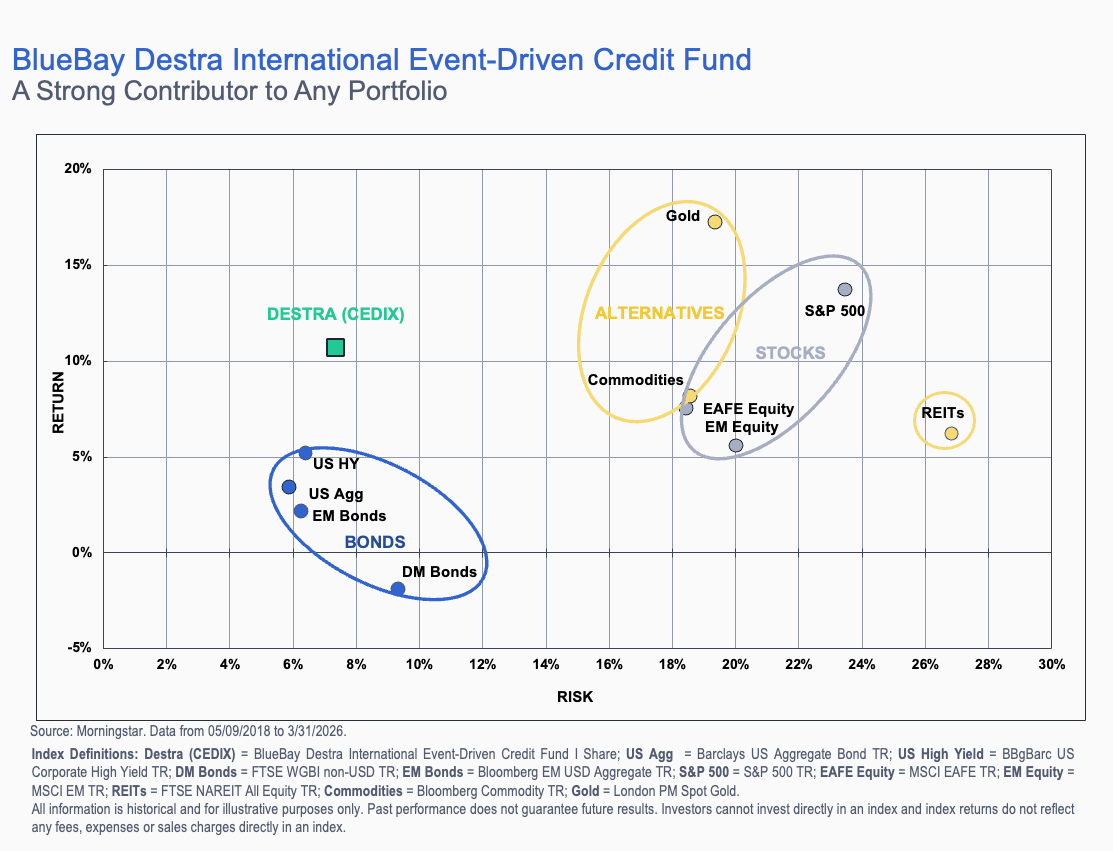 The Fund has delivered superior risk-adjusted returns to Stocks, Bonds, and Alternatives since inception7. Elevate portfolios “Up” (returns) and “to the Left” (risk) with Event-Driven Credit.