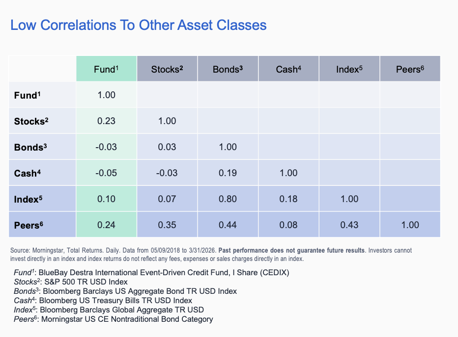 While the Fund boasts impressive returns over the time periods, it also may provide diversification based on its low correlation to other major asset classes such as Stocks2 (+0.23), Bonds3 (-0.03), and Cash4 (-0.05)