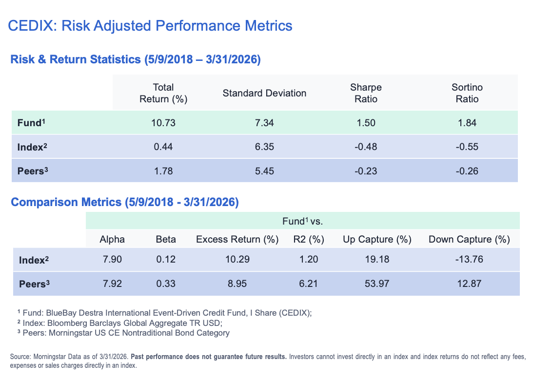 The Fund has produced remarkable sharpe and sortino ratios, alphas and excess returns vs a global market reference index (Bloomberg Global Aggregate Bond TR Index) and its Morningstar Peers Category (US CE Nontraditional Bond).