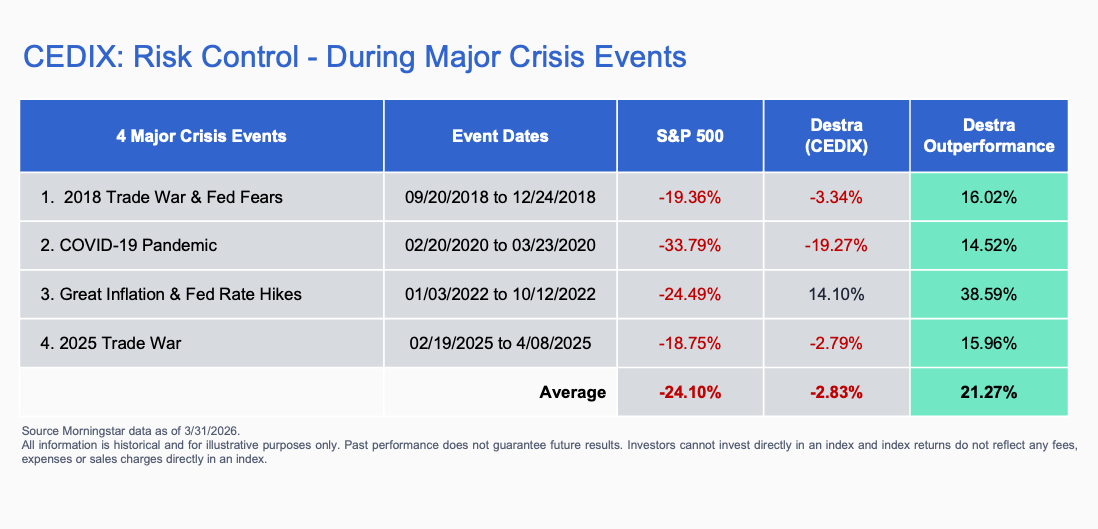 Since inception, CEDIX has demonstrated its ability to provide risk control during major crisis events in relation to the S&P 500 Index. During the 4 major stock market drawdown periods that the Fund has experienced, the S&P 500 average drawdown has been -24.10% vs CEDIX average drawdown of only -2.83%.