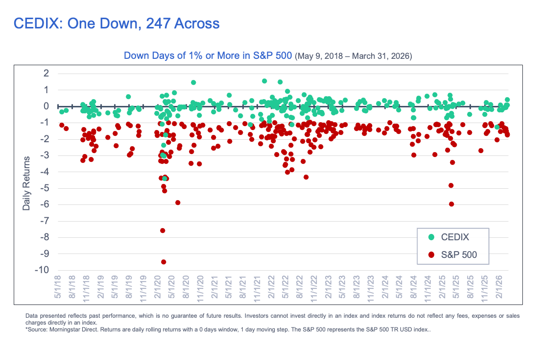 Since Inception of the Fund7, there have been 247 days where the S&P500 has gone down -1% or more. The cumulative return for the S&P500 on those days is -491.26% and the average down day is -1.99%. CEDIX experienced negative returns on only 135 of those days with a cumulative return of -24.97% and an average daily return of -0.10%.