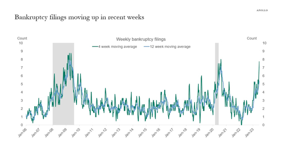 Source: Bloomberg, Apollo Chief Economist. Note: Filings are for companies with more than $50 million in liabilities. For week ending June 21, 2023.