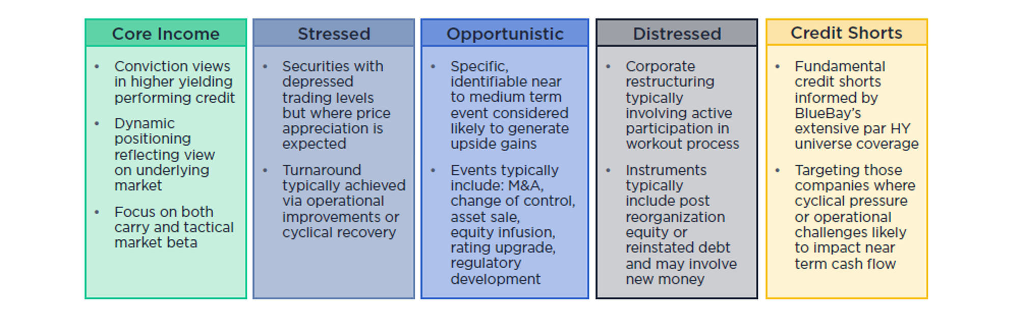 BlueBay is agnostic on sector, industry, or security type.They have developed different strategies to invest up and down the capital structure that offers the best risk adjusted return in their view. The allocation between strategies will typically be determined by the availability of different opportunities throughout the credit cycle.